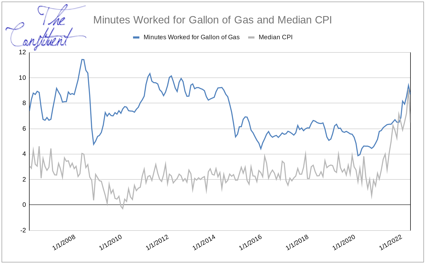 Some people blamed the high gas prices in the spring, but this didn’t make any sense either. What I find to be one of the most helpful ways to think about gas prices is by measuring how many minutes the average worker has to work to buy a gallon of gas. Since the “inflation adjusted price” of anything isn’t really a clear concept for a lot of folks, the number of minutes of work needed to pay for a gallon of gas is often more useful.